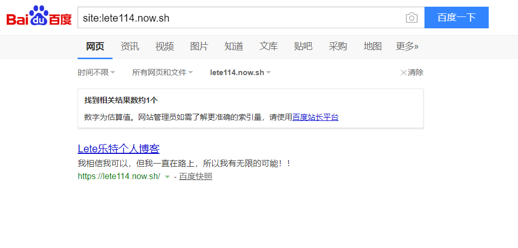 验证成功就能在,百度找到你的网站了,百度搜索框输入:如site:lete114.now.sh,但百度没有那么快,可能需要一两个星期甚至一个月(谷歌的话当天就可以收入,或者明天)。