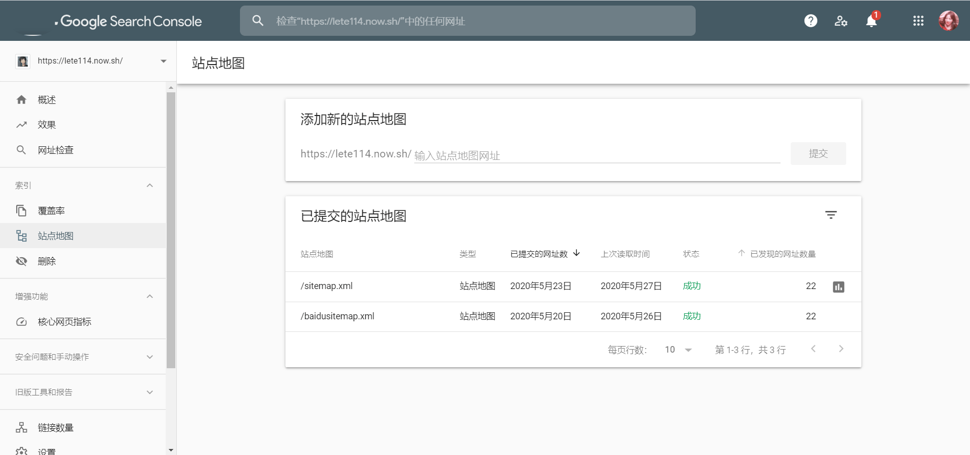 执行hexo g重新生成,会在public目录下生成sitemap.xml文件,发布后,就可以在 google 控制台提交这个 sitemap 了。